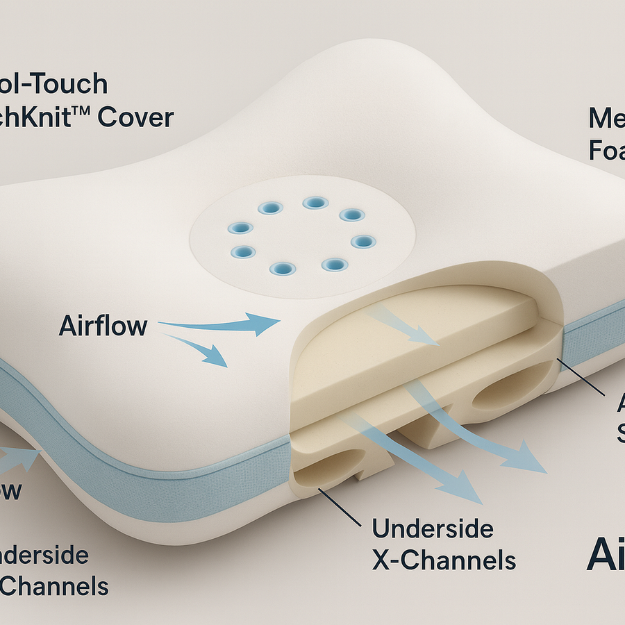 The center basin gently lowers the back of the head, which helps many sleepers maintain a calmer, supported neck angle and easier breathing- at the perfect angle. The High/Low edges let the neck land where it belongs, allowing transitions for all sleeping positions. Unique to Aligné, the 5-vent ring sits just outside the basin—exactly where warmth and humidity concentrate. You feel supported—and notably cooler.